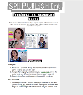 Based on my feedback I can see that the strengths of my current magazine are the photographs and layout as they appeal to the audience but it needs to look more indie. i intend to do this by changing the edit photograph on the front cover to black and white to make her look more edgy. i could also change some of the fonts to make them stand out more.